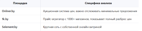 - Поддержка локальных площадок (Onliner.by, 1k.by) «из коробки»